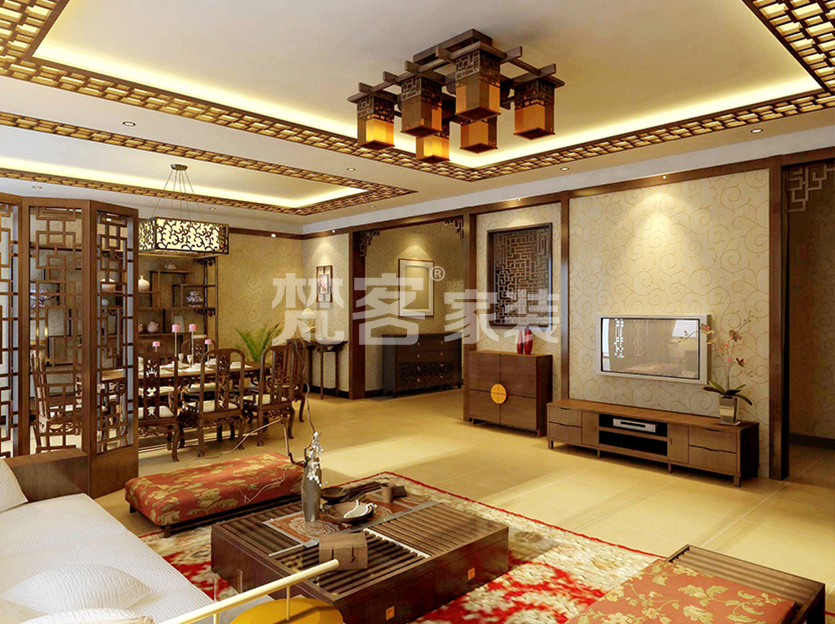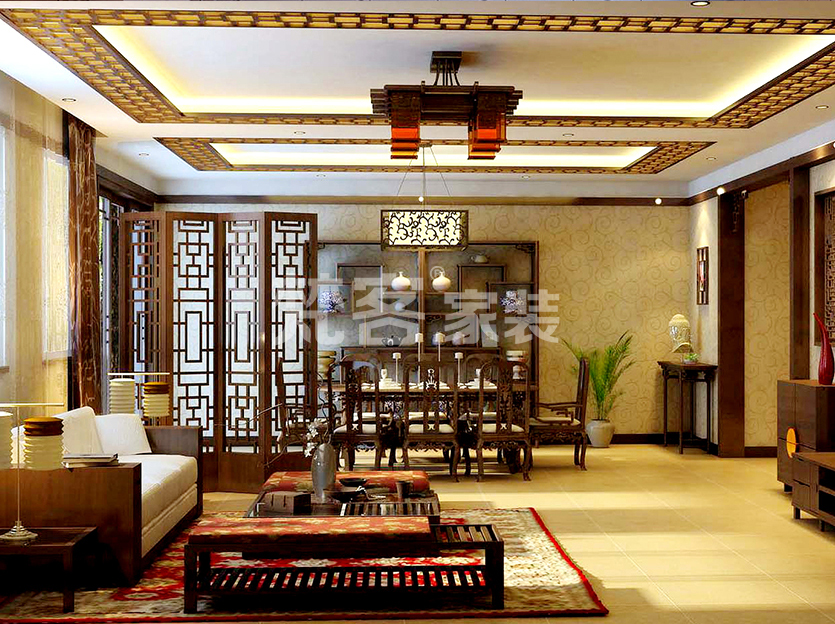 本方案屬于中式風格,含有中華民族古代元素、同時看出主人的品味,設計離不開歷史。在空間布局上,依據科學的設計原則,稍做變動,既保證了餐廳基本功能達到方便實用,又保持了最大限度的自然采光與通風。客廳部分在與走道相隔的人造隔墻中間設計的中式鏤空窗戶延長了電視墻的寬度,又達到了通透的效果,同時營造出更多的中式韻味來。與餐廳相連的一面用中式結構的博古架,實用又豐富了空間。
